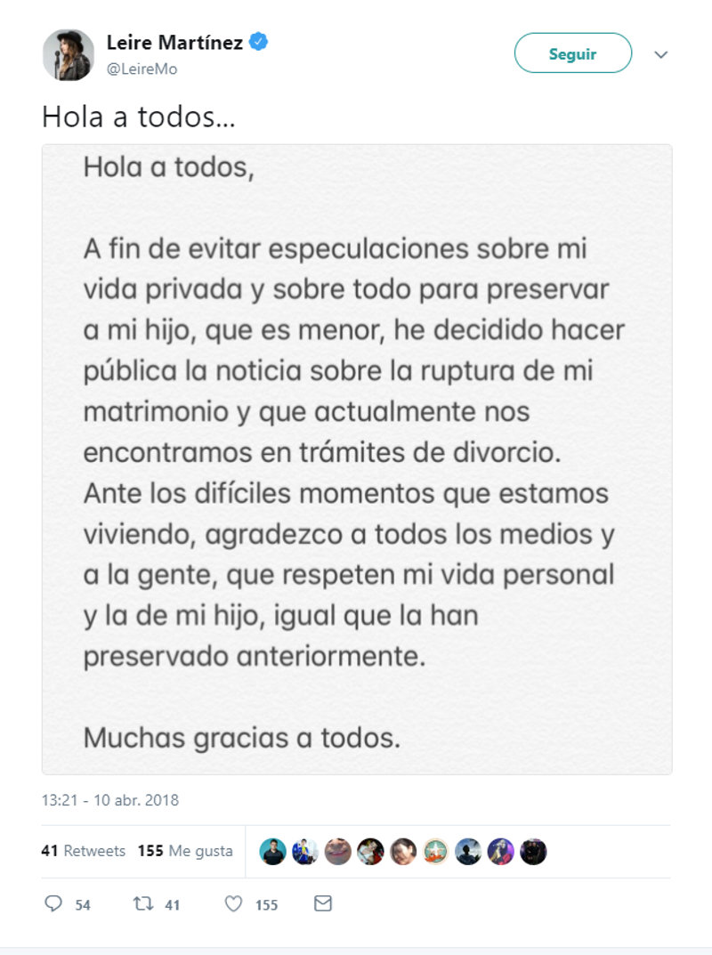 "A fin de evitar especulaciones sobre mi vida privada y sobre todo para preservar a mi hijo, que es menor, he decidido hacer pública la noticia sobre la ruptura de mi matrimonio y que actualmente nos encontramos en trámites de divorcio", confiesa la cantante vasca en su comunicado, en el que añade: "Ante los difíciles momentos que estamos viviendo, agradezco a todos los medios y a la gente, que respeten mi vida personal y la de mi hijo, igual que la han preservado anteriormente", zanja la artista.