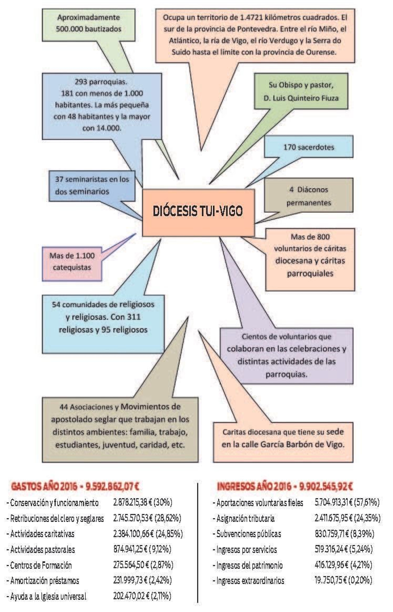 La Diócesis de Tui-Vigo manejó en 2016 un presupuesto que superó ligeramente los 9,9 millones de euros, que invirtió en su mayoría en conservación y funcionamiento de los lugares de culto y en retribuciones al clero y seglares, que se llevaron el 58% del total, quedando un 26% para ayudas sociales (caridad e Iglesia universal).