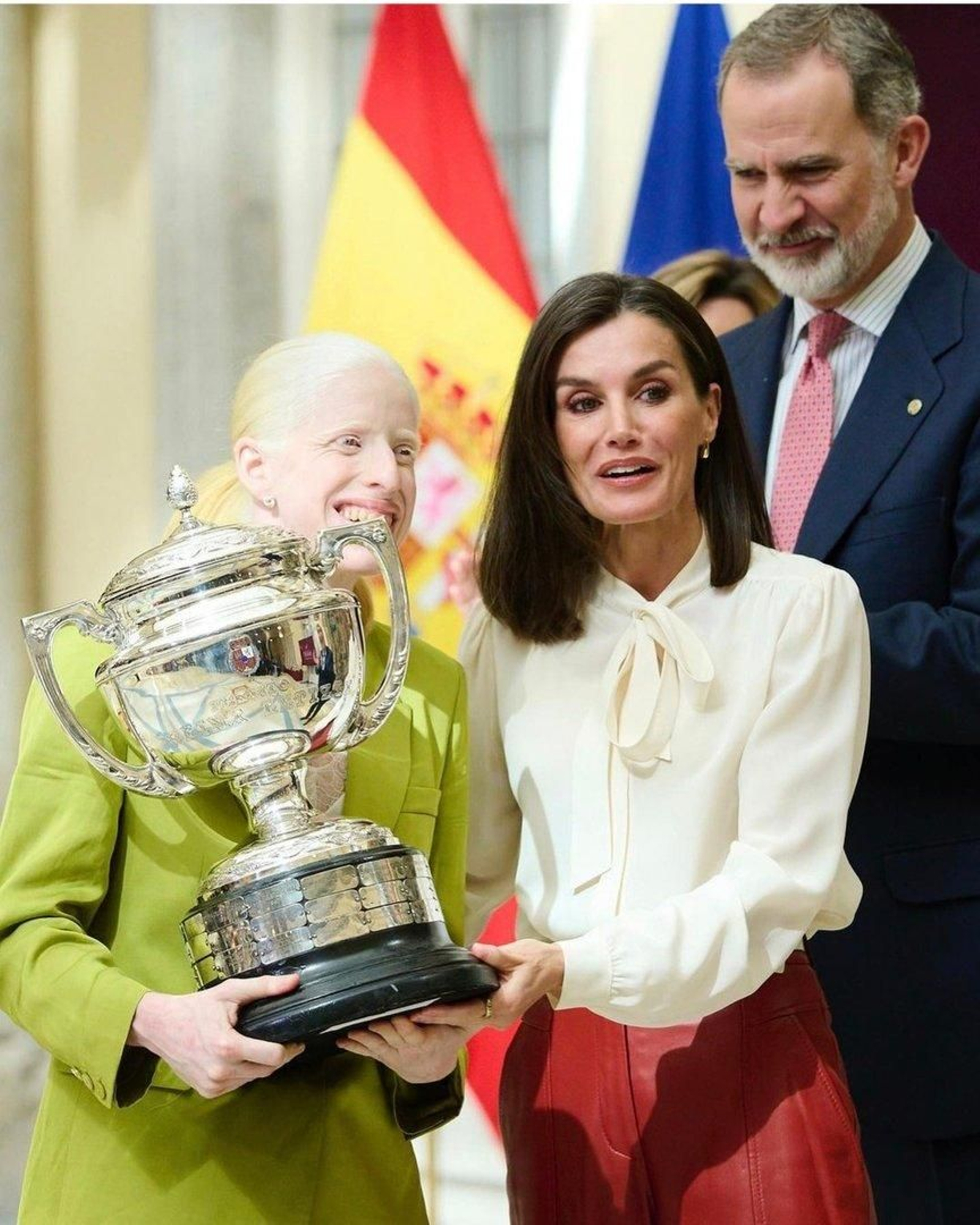 La que no se quita la sonrisa del rostro es nuestra campeonísima Susana Rodríguez Gacio. No es para menos, ya que no todos los días le dan a una el título de Premio Nacional del Deporte. Ahí les muestro a la paralímpica viguesa muy contenta recibiendo la copa de manos de la Reina Letizia ante la atenta mirada de Felipe VI ¡Enhorabuena!